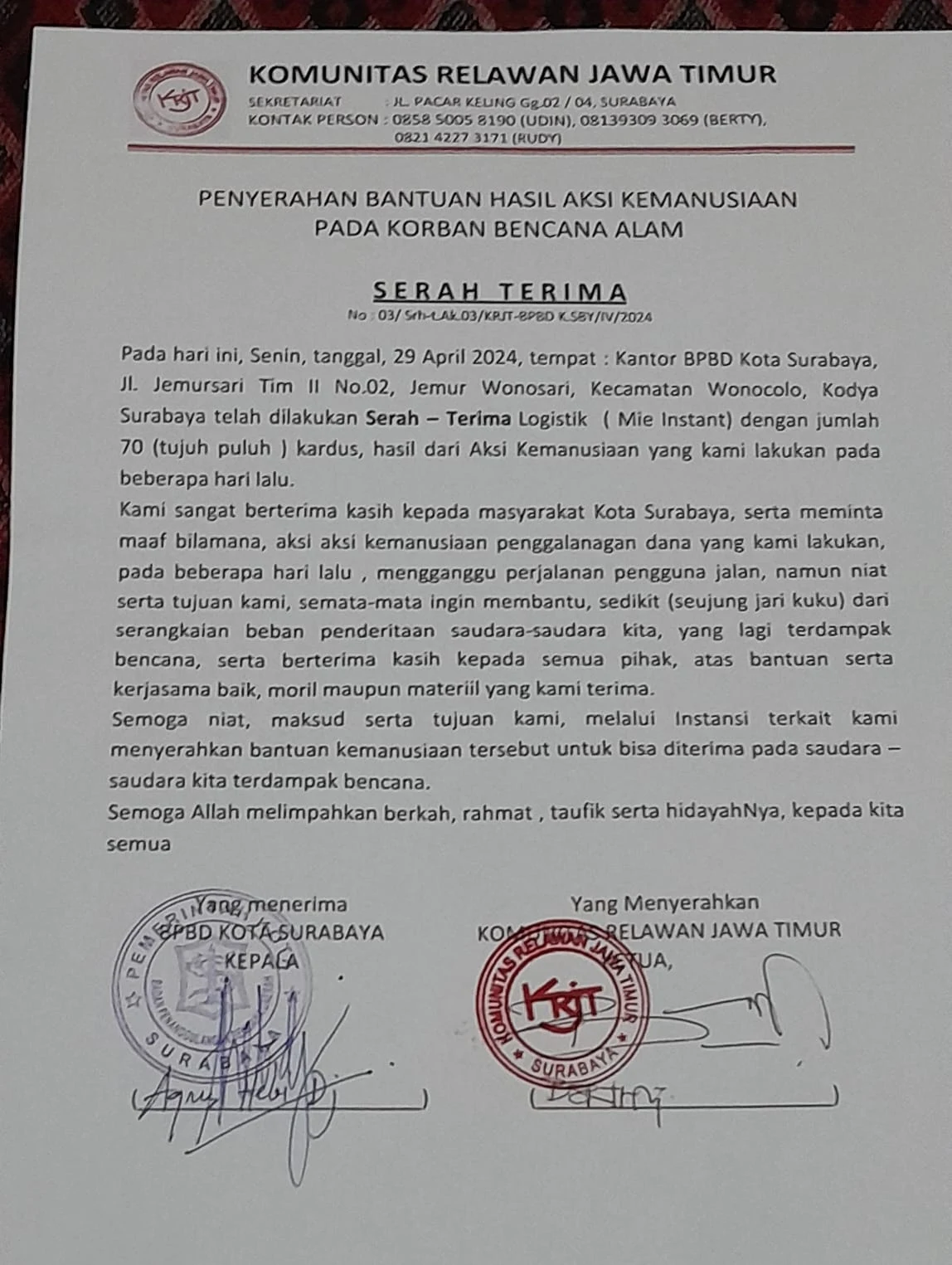 Lebih lanjut lagi,dengan kehadiran Komunitas Relawan Jawa Timur dari pihak Hepi selaku Kepala Badan Penanggulangan Bencana Daerah (BPBD) kota Soeroboyo, ada respon positif untuk kerja-sama, menegaskan "Bahkan mengajak kedepannya agar bersinergi dalam komunikasi untuk melakukan kegiatan kemanusiaan.ungkap pria berpawakan tinggi berkulit hitam dari Maluku saat itu. Dengan diterimanya bantuan KRJT, berupa 70 Kardus Mie Instan yang tertulis " Bantuan Kemanusiaan dari KRJT", ulas dia (korlap KRJT) tadi.maka dibuat surat tanda terima oleh Dinas BPBD. Keramahan dan diskusi soal langkah kedepan, seperti telah terjalin lama keakraban dalam pertemuan tersebut." Tegas Pria berdarah Jawa dan Ambon diruang rapat ketika itu.Sedangkan, didalam ruang rapat terjadi pembicara Saling memberi masukkan agar BPBD bisa Maksimal dan KRJT selalu kondisi melangkah, Semoga Kota Surabaya Selalu tanggap dalam mengantisipasi kejadian bencana alam.(BJP)